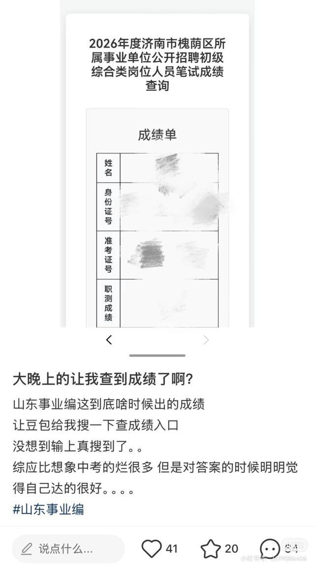4月23日晚间,有网友发帖称,“豆包查到2026山东事业编成绩了”,并附上一张成绩单,但成绩部分涂掉了。“不过好像只有济南槐荫区的能查,是不是属实咱也不知道,到底啥情况呀?”4月24日,记者联系上该网友了解到,帖子内容来自其他网友,但目前原帖网友已经删除了帖子。